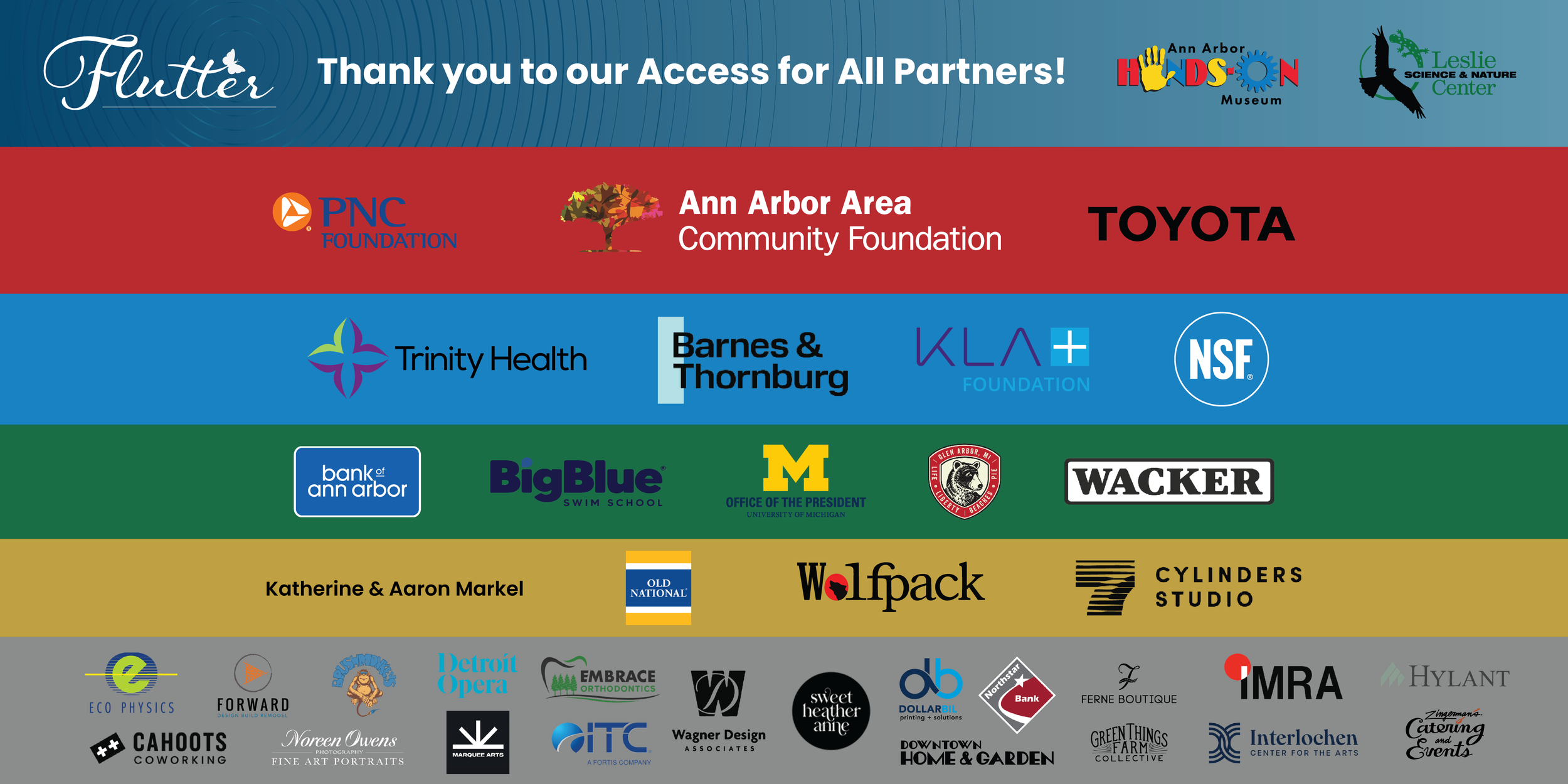 Flutter is a fundraiser for the Access for All initiatives of the Ann Arbor Hands-On Museum and Leslie Science & Nature Center. On September 19, we’ll gather among the gardens at the Nature Center to enjoy a seated dinner, silent auction, wildlife experiences, and more. We invite you to reserve your seat above!