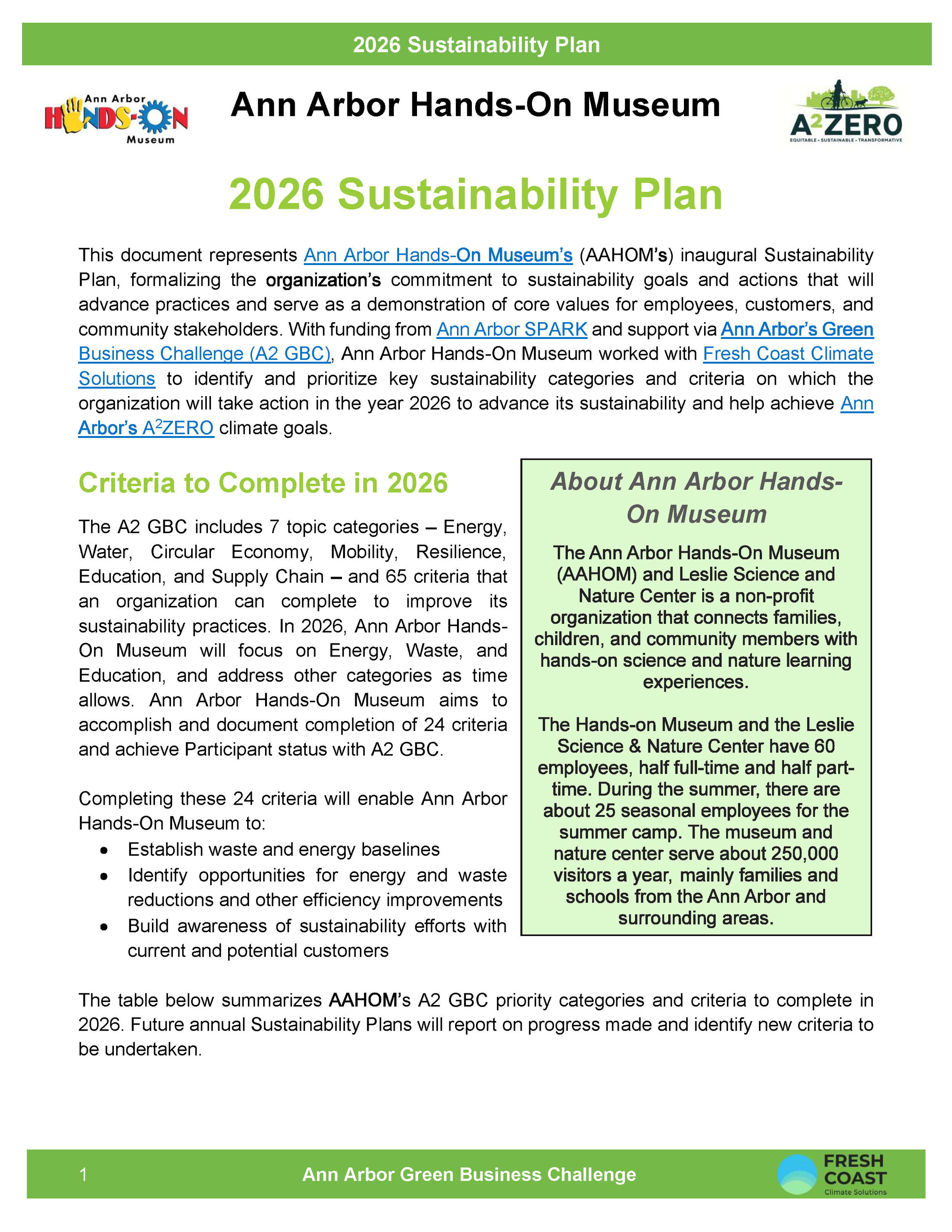 With funding from Ann Arbor SPARK and support via Ann Arbor’s Green Business Challenge, Ann Arbor Hands-On Museum worked with Fresh Coast Climate Solutions to identify and prioritize key sustainability categories and criteria on which the organization will take action in the year 2026 to advance its sustainability and help achieve Ann Arbor’s A2ZERO climate goals.